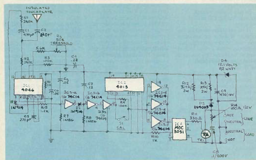 Este circuito algo complejo fue encontrado en la revista Radio Electronics en mayo de 1984. El circuito activa una etapa de potencia con un triac para cargas conectadas a la red eléctrica.
