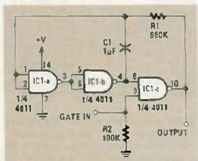 Otro oscilador disparado que encontramos en la revista Radio Electronics de noviembre de 1984. La frecuencia también viene dada por R1 y C1.