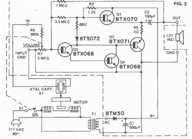 Este es el circuito de un tocadiscos de los años 70. Lo encontramos en un artículo de reparación en la revista Radio Electronics de diciembre de 1974. El circuito se alimenta de la red eléctrica.