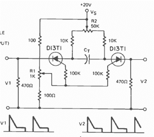 Usando dos PUT, este circuito genera señales como se muestra en la figura. El circuito es de una Radio Electronics de marzo de 1973. Observe la tensión de alimentación del circuito.