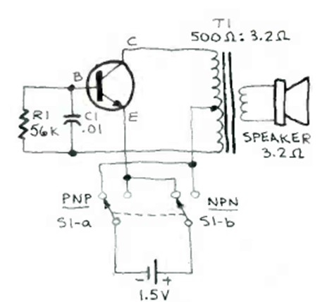 Esta sencilla prueba para transistores de uso general no es más que un oscilador Hartley. El transformador es del tipo que se encuentra en las radios de transistores antiguas.