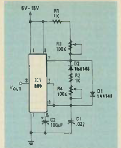Encontrado en Radio Electronics desde septiembre de 1984, este circuito tiene ajuste de ancho de pulso e intervalo. El circuito tiene la frecuencia básica dada por C1.