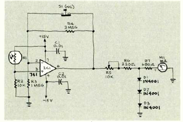 Este circuito fue encontrado en la revista Radio Electronics de diciembre de 1983. El sensor es un LDR y la fuente de alimentación debe ser simétrica. Puedes utilizar un multímetro común en lugar de un medidor analógico.