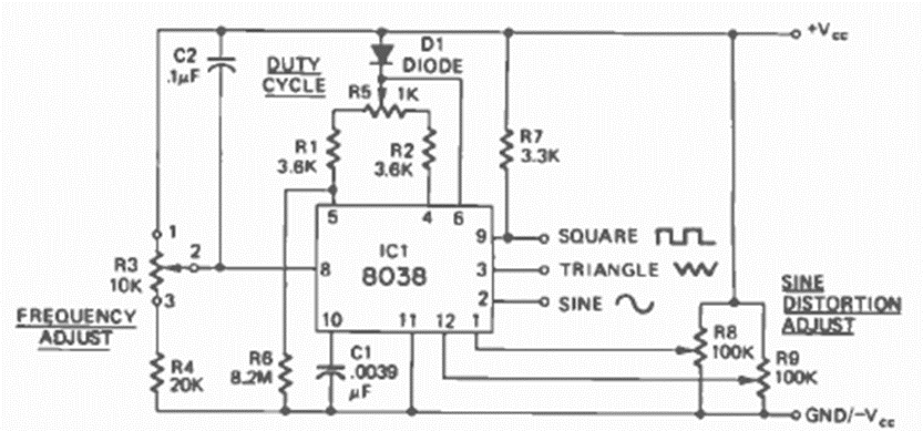 Este es otro de los muchos circuitos que tenemos con el 8038. El circuito es de la revista Radio Electronics de noviembre de 1974. La fuente de alimentación típica es de 10 V y tenemos ajustes tanto para la frecuencia como para la simetría de las señales generadas.
