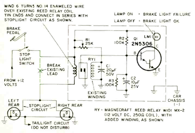 Este antiguo circuito de automóvil fue encontrado en un artículo de una revista de Radio Electronics de agosto de 1971. El transistor es un Darlington de potencia según la potencia de la lámpara.