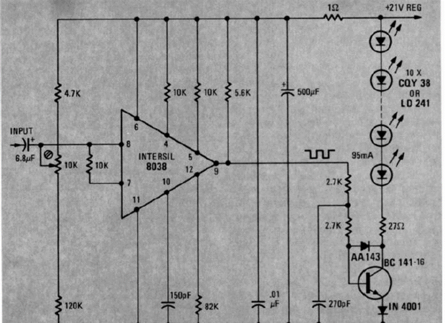 Este circuito es de Radio Electronics de marzo de 1977. El circuito integrado es de la época y el circuito está destinado a un enlace de audio por infrarrojos. La modulación es frecuencia de pulso.