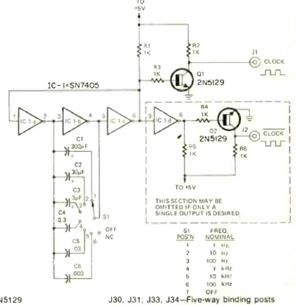 Encontramos este circuito en la revista Radio Electronics de diciembre de 1972. Genera señales en 6 bandas de frecuencia, lo que lo hace adecuado para aplicaciones experimentales con circuitos TTL.