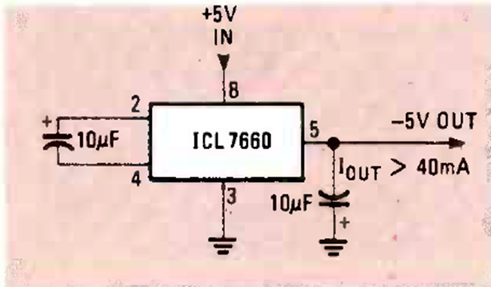 Este circuito fue encontrado en la revista Radio Electronics de mayo de 1982. El circuito invierte la polaridad de una fuente para obtener una tensión de -5 V.