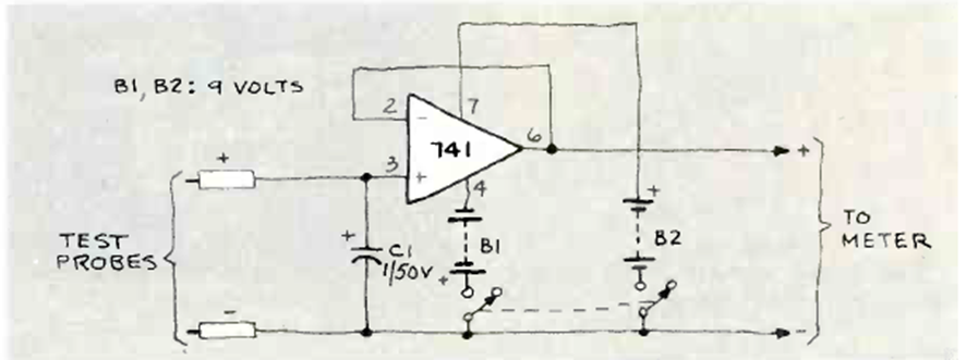 El propósito de este circuito es únicamente aumentar la resistencia de entrada de un multímetro, ya que no hay ganancia de tensión. Las baterías son de 9 V y se pueden utilizar equivalentes operacionales.
