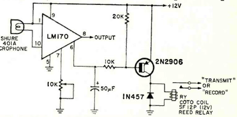 Usando el circuito integrado LM170, este circuito se encontró en la revista Radio Electronics de mayo de 1970. El transistor es de propósito general y el potenciómetro ajusta la ganancia.