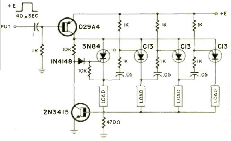 Este circuito cuenta digitalmente los pulsos de entrada. El circuito de radioelectrónica de noviembre de 1970 utiliza transistores unijuntura programables. Tenga en cuenta la duración de los pulsos contados.