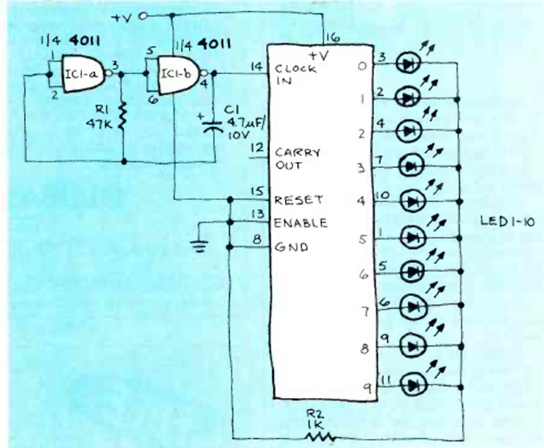 Este contador se encontró en la revista Radio Electronics de noviembre de 19983. La fuente de alimentación suele estar entre 3 y 12 V. La velocidad de conteo depende de C1.