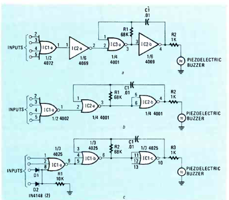 En la figura tenemos 3 osciladores con puertas lógicas que pueden activarse mediante señales lógicas externas. Los circuitos se encontraron en la revista Radio Electronics de abril de 1987.