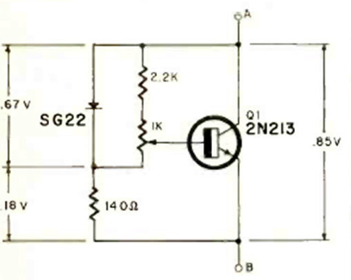 Este circuito simula un diodo cuyas características se pueden ajustar en un trimpot. El circuito es de una Radio Electrónica de diciembre de 1971, sirviendo para circuitos en los que el diodo es un componente crítico como por ejemplo la polarización de amplificadores.