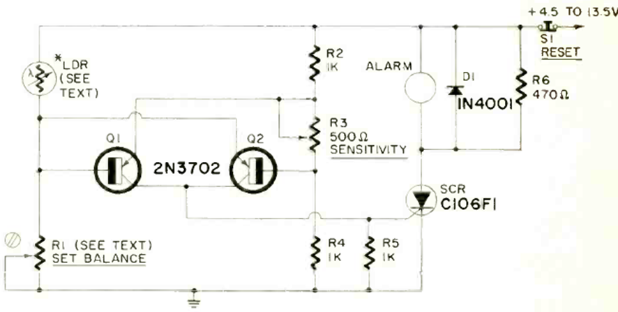 Encontrado en un artículo de la revista Radio Electronics de agosto de 1971, este circuito admite SCR de la serie 106 y los transistores son de propósito general, como los BC.