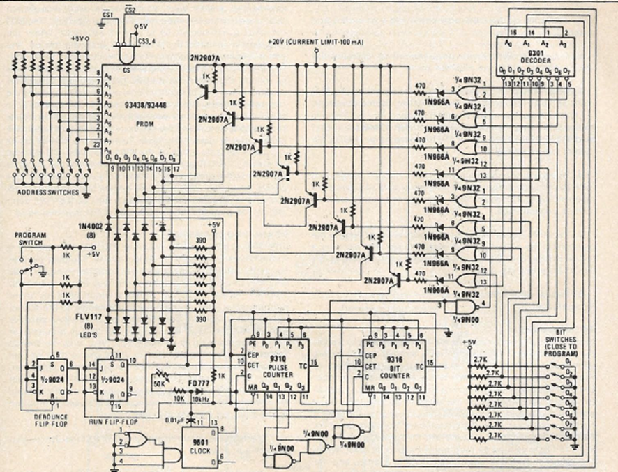 Este es un circuito típico de un programador PROM de los años 70. Apareció en la revista Radio Electronics en 1979. Tenga en cuenta que la programación se realizaba manualmente byte a byte mediante interruptores.