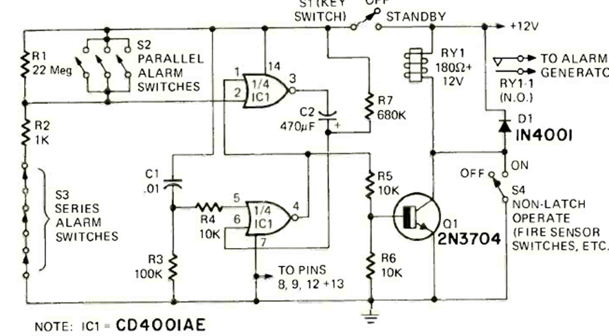 Esta alarma con apagado automático fue encontrada en la revista Radio Electronics de abril de 1975. El tiempo de activación viene dado por C1 y R3. La alarma utiliza sensores en serie y en paralelo.