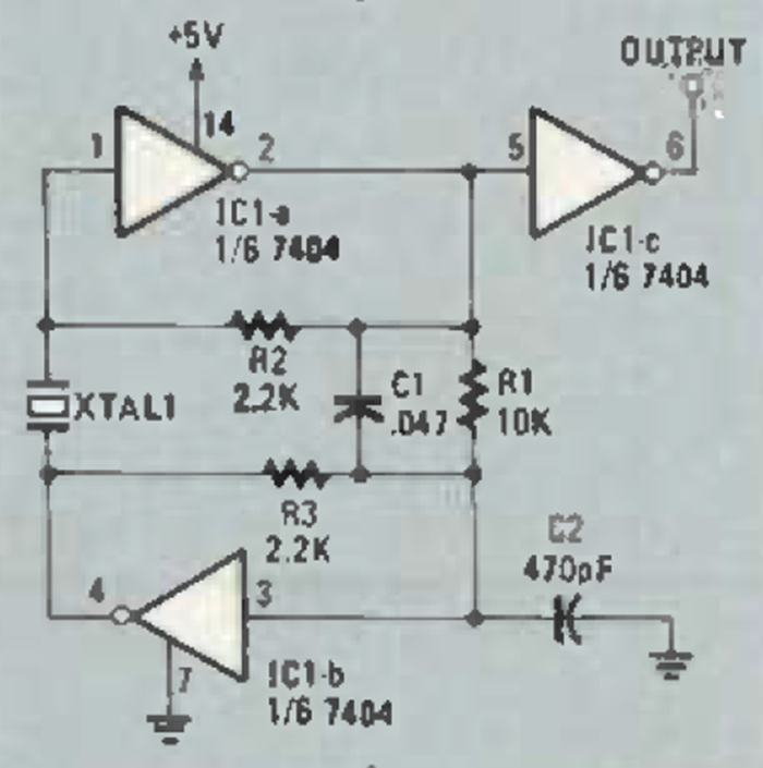 Este circuito lo encontramos en la revista Radio Electronics de diciembre de 1986. Utiliza 3 inversores y su frecuencia está determinada por el cristal. La fuente de alimentación es de 5 V.