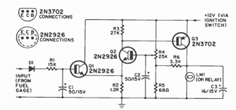 Este circuito fue encontrado en la revista Radio Electronics de abril de 1971. Utiliza transistores comunes y se puede adaptar para usar un LED o un indicador de sonido en lugar de una lámpara.