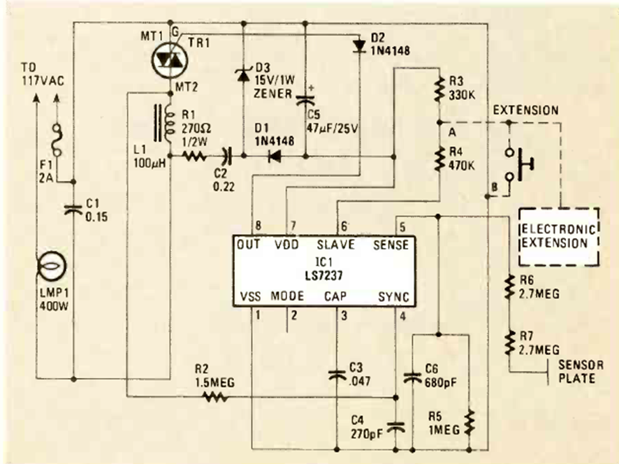 Este atenuador para lámparas incandescentes que utilizan triac y un LF7237 se encontró en la revista Radio Electronics de mayo de 1985. El circuito admite botones de extensión.