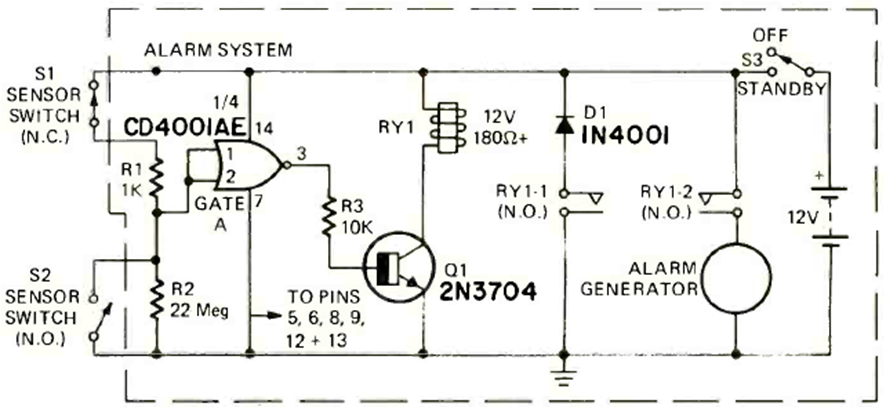Este circuito de alarma se encontró en la revista Radio Electronics de abril de 1975. El circuito utiliza una fuente de alimentación de 12 V y un relé, pero se puede modificar para que funcione con otras tensiones.