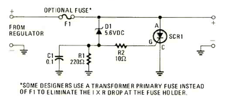 Este circuito de protección de fuente se encontró en la revista Radio Electronics de diciembre de 1978. El SCR se activa al cortocircuitar la fuente y quemar rápidamente el fusible de protección.