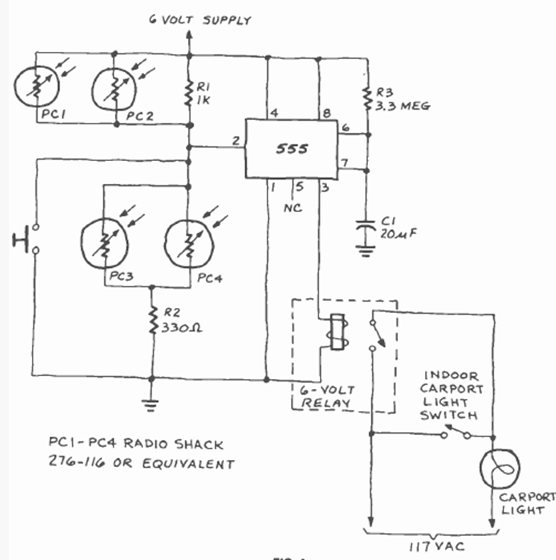 Recomendado para aplicaciones automotrices, este circuito se encontró en la revista Radio Electronics de noviembre de 1980. Los sensores son LDR comunes y la aplicación recomendada es la iluminación de luces de garaje.