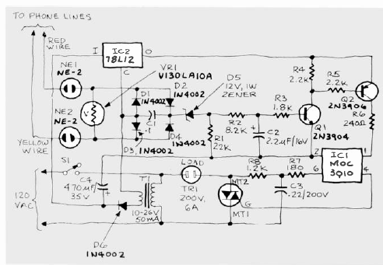 Este circuito se encontró en Radio Electronics en octubre de 1983. Se aplica a teléfonos de línea analógica más antiguos. El circuito utiliza componentes comunes.