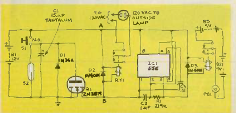 Este circuito fue encontrado en la revista Radio Electronics de septiembre de 1984. El circuito está basado en un 555 y un MOSFET que consta de un intermitente que controla una campana.