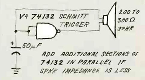 Este circuito es para transductores (teléfonos o parlantes) de 200 a 300 ohms. La frecuencia la del capacitor. El circuito es de una Radio Electronics de octubre de 1982.
