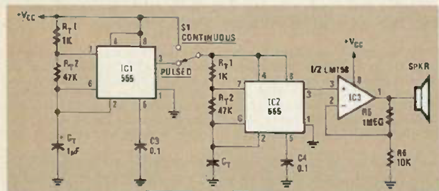 Este circuito opera de 25 a 65 kHz dependiendo del transductor utilizado y la configuración. Lo encontramos en la revista Radio Electronics de julio de 1985. No se proporciona alimentación de 9V a 12V.