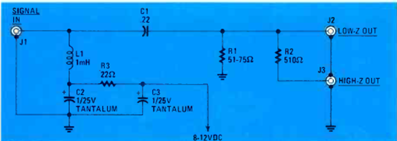 Este circuito fue encontrado en la revista Radio Electronics de abril de 1983. Su finalidad es acoplar una antena a dos receptores sin problemas de pérdidas de acoplamiento.