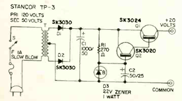 Esta fuente de 20 V es la recomendada para el circuito anterior, teniendo una corriente de unos 200 mA dependiendo de los transistores utilizados. El circuito es de una Radio Electronics de octubre de 1970.