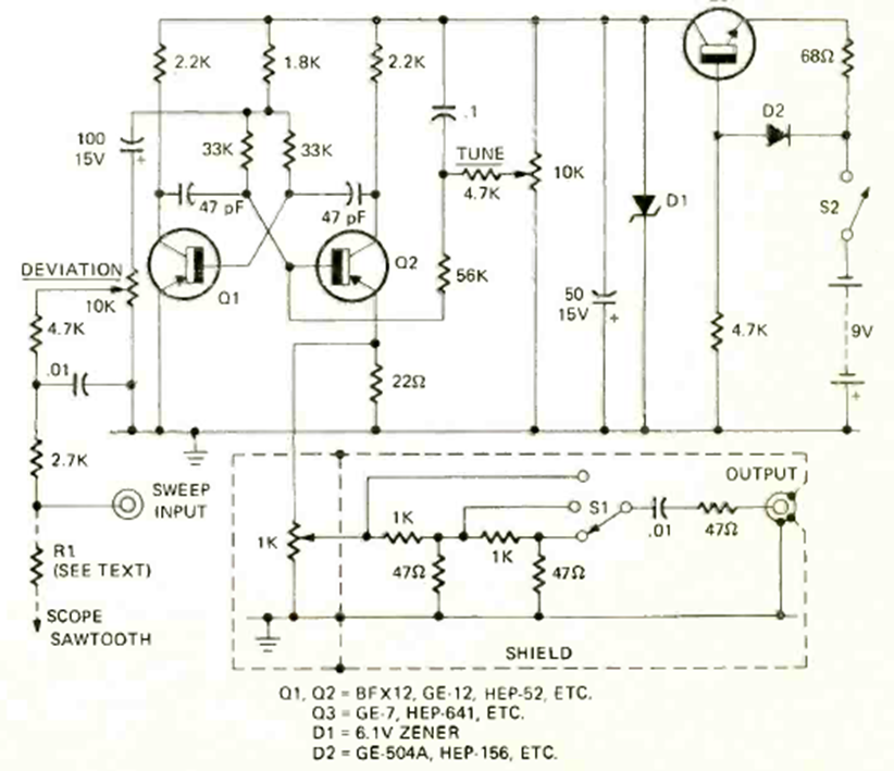 Este circuito con transistores de la época fue encontrado en la revista Radio Electronics en noviembre de 1972. El circuito también genera una señal en diente de sierra para ser utilizada en un osciloscopio.