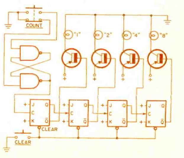 Este circuito TTL fue encontrado en la revista Radio Electronics de febrero de 1973. La alimentación debe ser de 5 V. El contador es de 4 bits. Los transistores son tipos de propósito general.