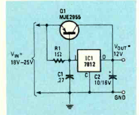 Este circuito aparece en otra parte de nuestro sitio web con los transistores más diversos. Esto es de Radio Electronics de julio de 1984. El circuito integrado y el transistor deben tener disipadores de calor.