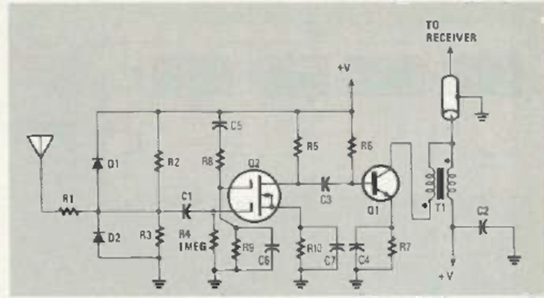 Aunque utiliza un FET de doble canal, que es difícil de encontrar hoy en día, este circuito fue lanzado en Radio Electronics en abril de 1986. Sirve como amplificador de señal para una amplia gama de frecuencias.