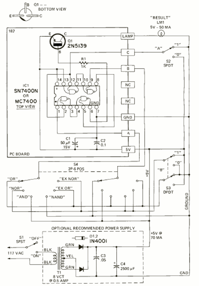 Este circuito lo encontramos en la revista Radio Electronics de mayo de 1972. Su finalidad es enseñar lógica utilizando circuitos integrados de la familia TTL. Se incluye fuente de alimentación de 5V.