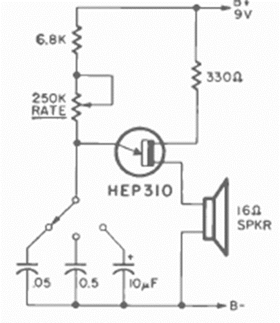 Otro de los muchos circuitos de este tipo que tenemos en este apartado. Esto fue encontrado en la revista Radio Electronics de julio de 1971. El circuito utiliza una unijuntura de la época, pero admite equivalentes.