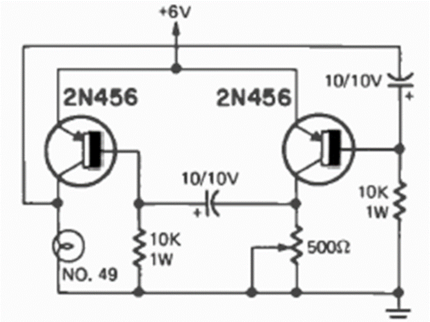Este estroboscopio con lámpara incandescente se encontró en la revista Radio Electronics de febrero de 1974. La lámpara es de 50 a 100 mA y los transistores pueden ser BC558.