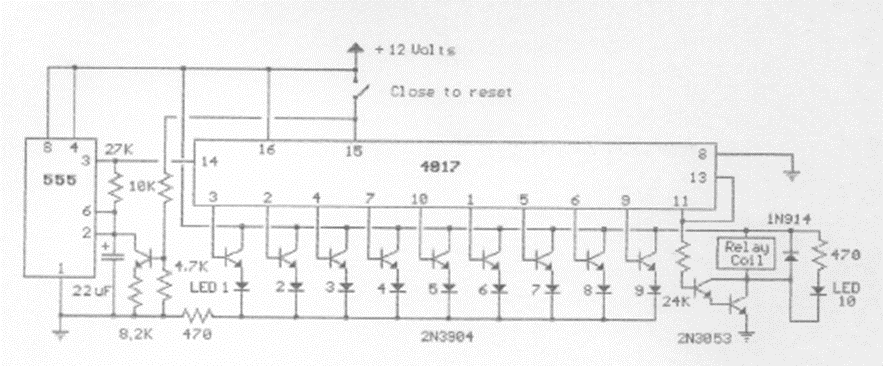Este circuito se obtuvo de documentación de los años 90. La solución que se puede encontrar en otra parte de este sitio implica la activación secuencial de LED y se basa tanto en el 4017 como en el 555. El tiempo de cada paso depende del capacitor al lado del 555.