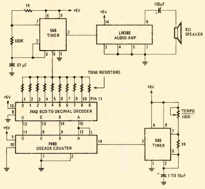 Este circuito generador de tonos secuencial se encontró en la revista Radio Electronics de julio de 1980. Utiliza circuitos integrados bien conocidos. Los tonos están dados por resistencias de programación.