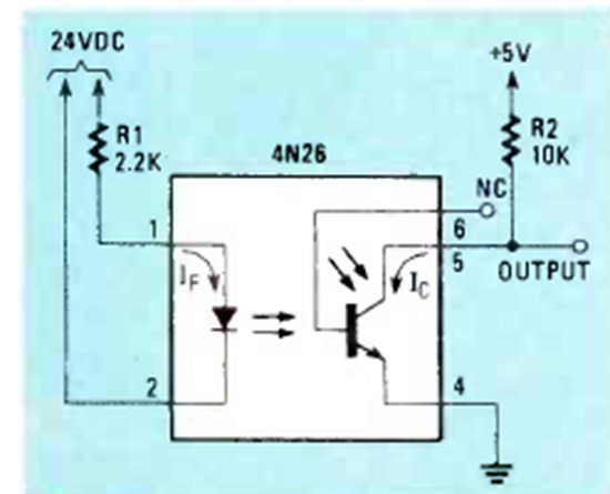 En la figura vemos cómo interconectar una señal de 24 V con lógica TTL usando un acoplador 4N26. El circuito es de una Radio Electronics de mayo de 1985.