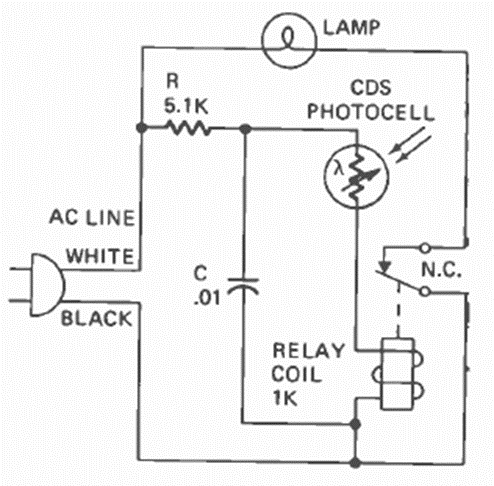 Este circuito activa un relé que carga una lámpara. El circuito es de Radio Electronics de noviembre de 1975. El sensor es un LDR común. El relé es del tipo sensible de alta tensión.