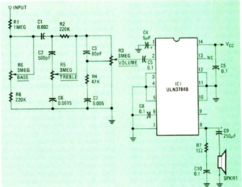 Este circuito con el ULN3784B apareció en la revista Radio Electronics en octubre de 1984. Normalmente, la energía se puede suministrar con tensiones de 9 a 24 V.