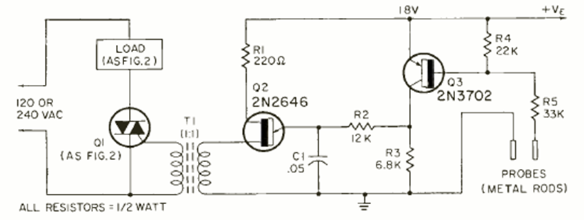 Este circuito es de una revista de Radio Electronics de julio de 1970. Los sensores son sondas metálicas. La fuente de 18 V debe estar aislada de la red eléctrica.