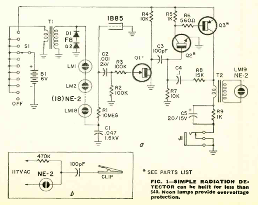 Este circuito fue publicado en un Radio Electronics de enero de 1971 para comprobar las emisiones de televisión. El circuito utiliza una válvula Geiger IB85 de la época cuya dirección de compra fue proporcionada por la revista.