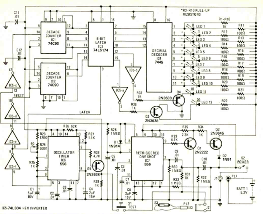 Publicado en un artículo de la revista Radio Electronics de febrero de 1978, este circuito digital utiliza algunos circuitos integrados de la época. El circuito utiliza una escala de barra LED.