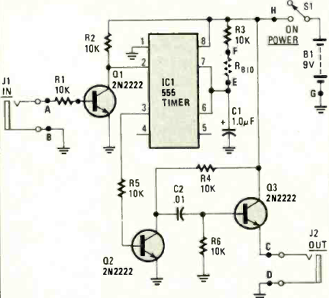 Este sensible circuito de monitor biológico se encontró en la revista Radio Electronics de diciembre de 1984. El circuito funciona con una batería de 9 V y utiliza un teléfono de baja impedancia en la salida.