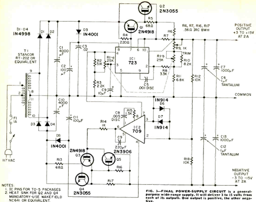 Este circuito se obtuvo de la revista Radio Electronics en septiembre de 1971. Los transistores de potencia deben estar equipados con disipadores de calor. El 709 es un amplificador operacional de la época.